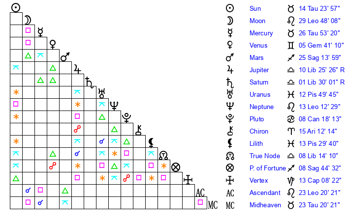 | Sun | 14 Taurus 24 | 15 Taurus 27 | 23 Leo 1 |