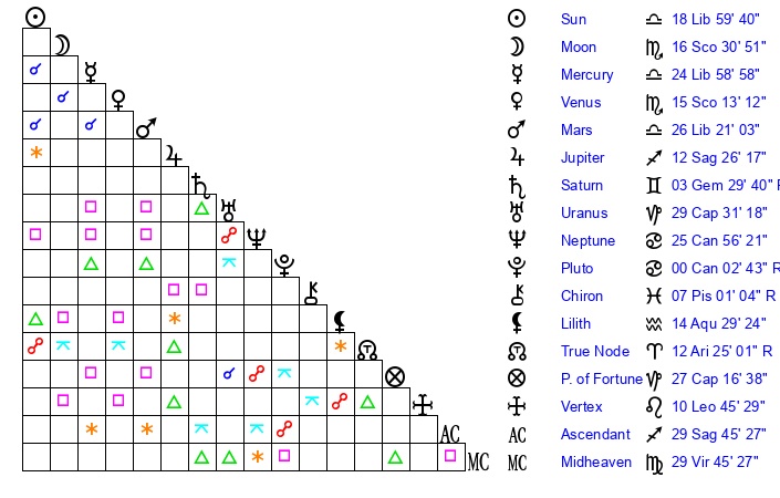 | Sun | 19 Libra 0 | 19 Libra 37 | 13 Aquarius 16 |