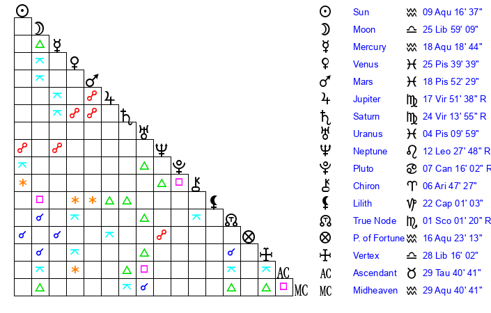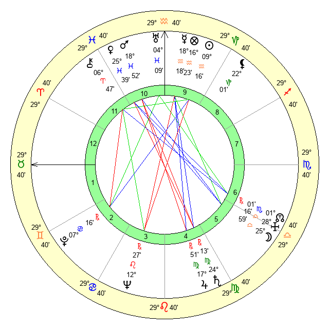 | Saturn | 24 Virgo 58 | 17 Pisces 6 | 18 Virgo 44 |
