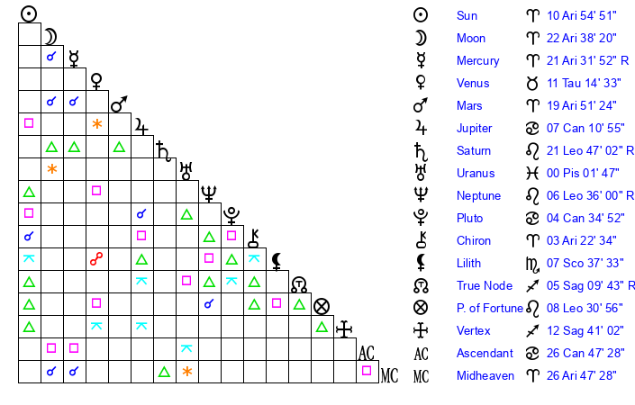 | Mars | 19 Aries 51 | 23 Cancer 50 | 5 Cancer 22 |