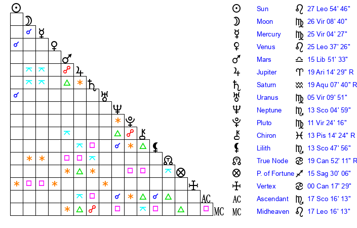 | Moon | 26 Virgo 10 | 9 Leo 47 | 24 Sagittarius 55 |