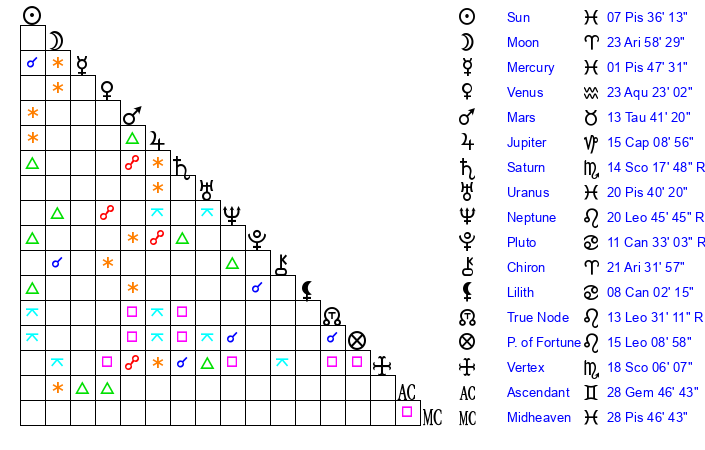 | Sun | 7 Pisces 36 | 8 Pisces 21 | 15 Gemini 27 |