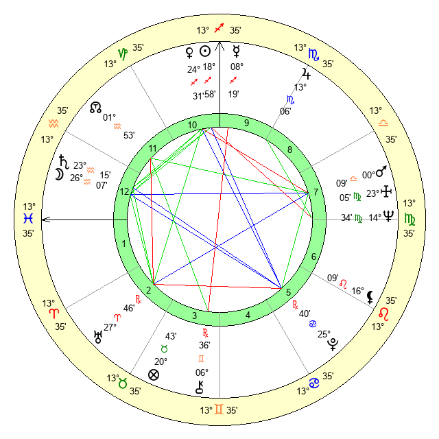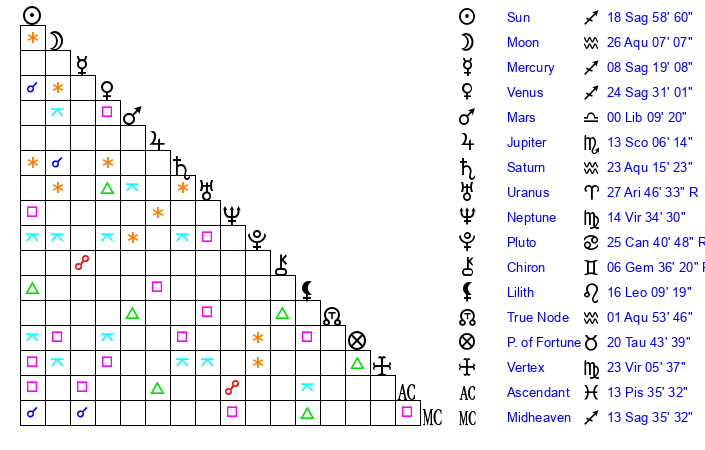 | Moon | 25 Aquarius 57 | 18 Virgo 1 | 29 Gemini 6 |