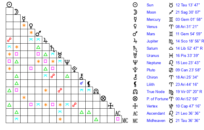 | Sun | 12 Taurus 14 | 13 Taurus 30 | 19 Leo 54 |