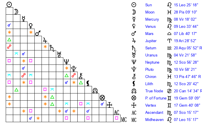 | Pluto | 10 Virgo 59 | 2 Aquarius 14 | 13 Virgo 4 |