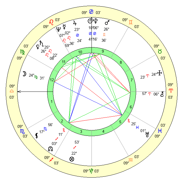 | Moon | 24 Virgo 43 | 21 Libra 52 | 11 Leo 55 |