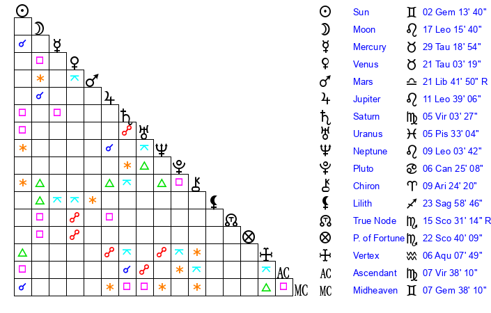 | Sun | 2 Gemini 13 | 2 Gemini 49 | 12 Virgo 48 |