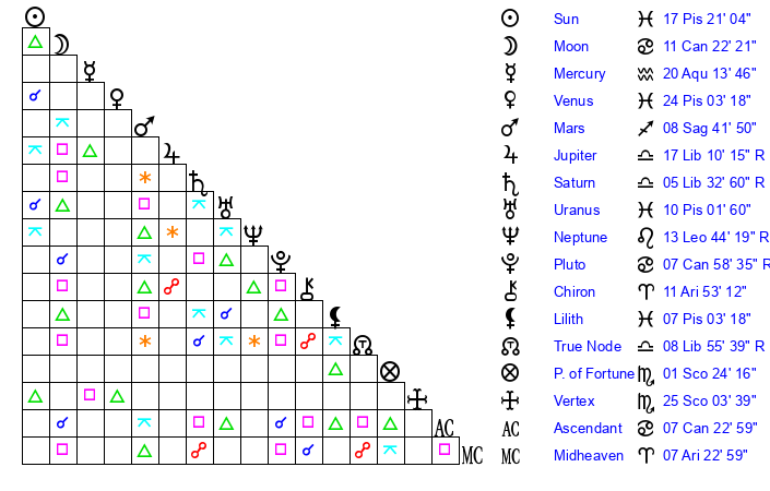 | Sun | 17 Pisces 21 | 18 Pisces 22 | 27 Gemini 36 |