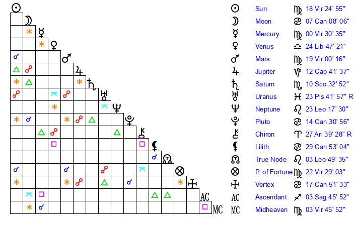 | Sun | 18 Virgo 25 | 19 Virgo 12 | 28 Sagittarius 19 |