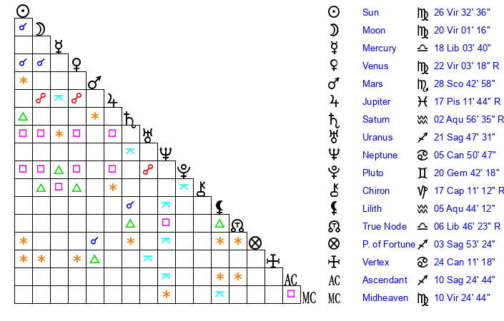 | Moon | 19 Virgo 58 | 14 Virgo 58 | 2 Pisces 19 |