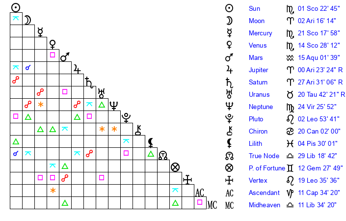 | Moon | 2 Aries 22 | 18 Sagittarius 11 | 20 Taurus 32 |