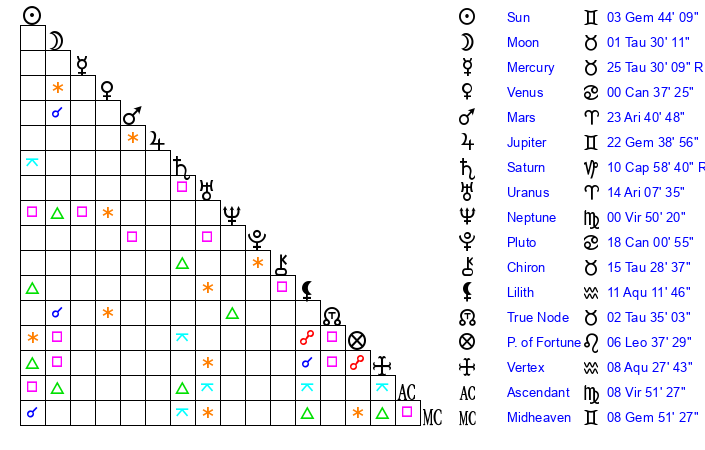 | Sun | 3 Gemini 45 | 4 Gemini 44 | 4 Virgo 39 |