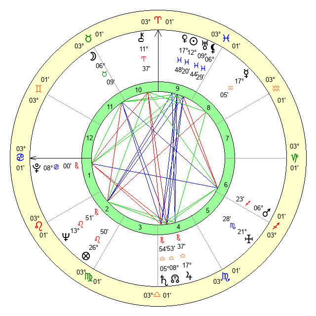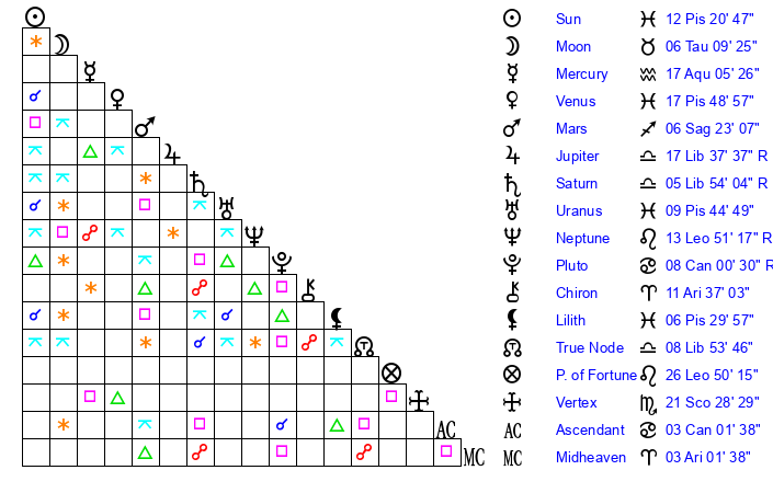 | Sun | 12 Pisces 21 | 13 Pisces 22 | 22 Gemini 50 |