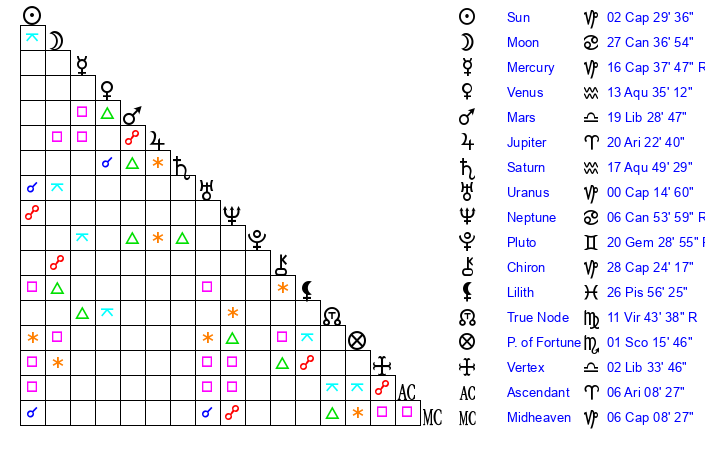 | Moon | 27 Cancer 29 | 25 Aquarius 42 | 12 Capricorn 56 |