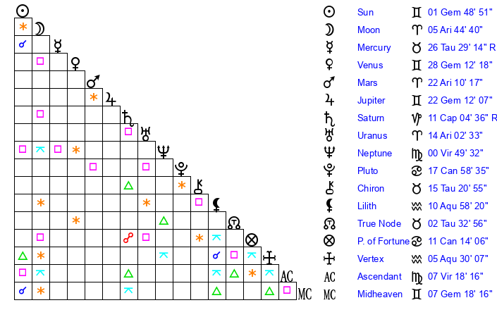 | Mars | 22 Aries 10 | 16 Leo 43 | 28 Gemini 53 |