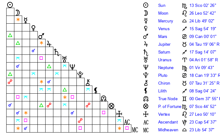 | Sun | 13 Scorpio 3 | 13 Scorpio 32 | 21 Aquarius 30 |