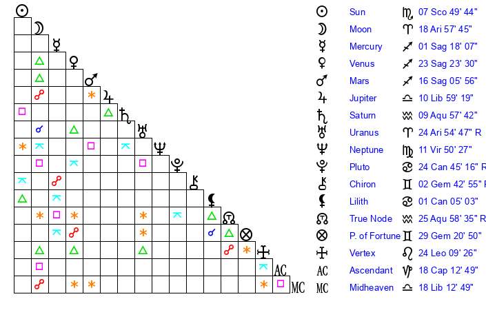 | Sun | 7 Scorpio 49 | 8 Scorpio 31 | 11 Aquarius 9 |