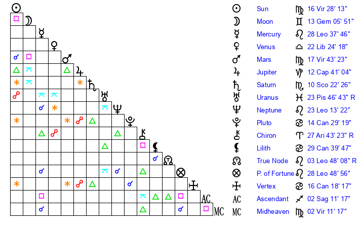 | Sun | 16 Virgo 29 | 17 Virgo 16 | 26 Sagittarius 17 |
