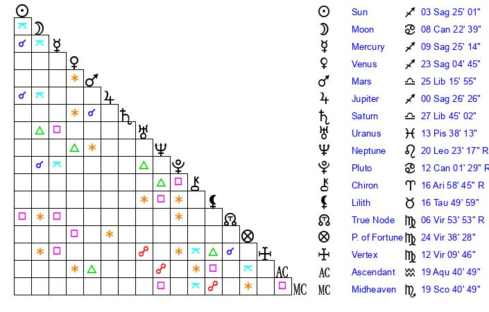 | Jupiter | 0 Sagittarius 15 | 24 Cancer 47 | 18 Sagittarius 22 |