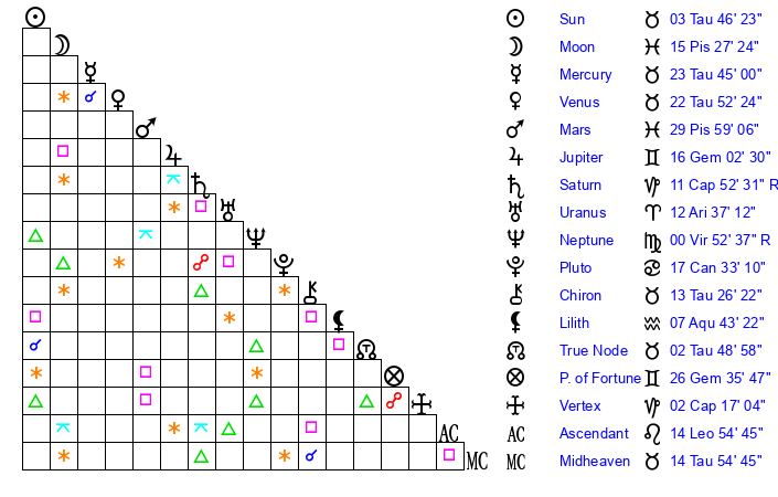 | Sun | 3 Taurus 47 | 4 Taurus 46 | 4 Leo 52 |