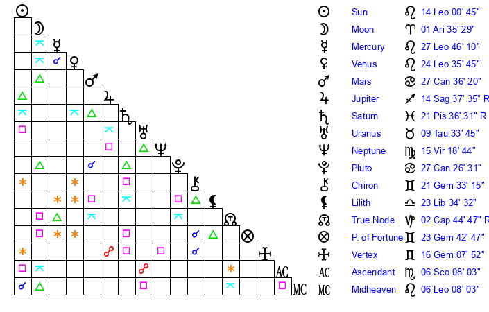 | Venus | 24 Leo 36 | 7 Cancer 36 | 14 Sagittarius 4 |
