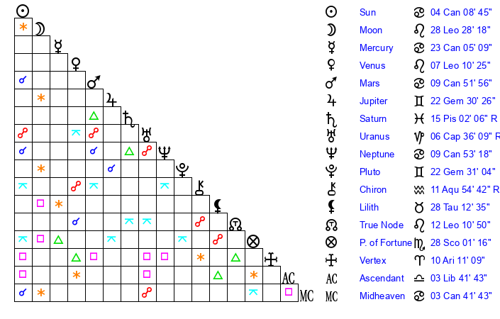 | Moon | 28 Leo 32 | 22 Cancer 20 | 18 Capricorn 6 |
