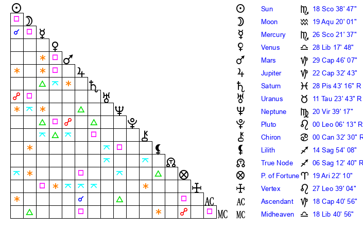 | Sun | 18 Scorpio 38 | 19 Scorpio 18 | 18 Aquarius 1 |