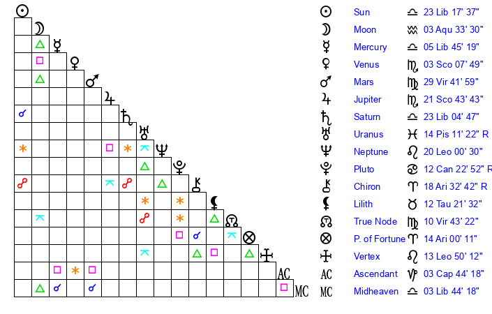 | Saturn | 23 Libra 38 | 26 Pisces 28 | 2 Scorpio 45 |