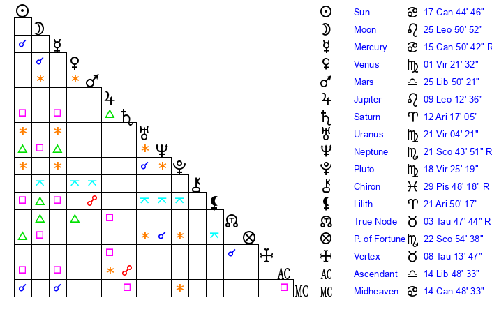 | Moon | 25 Leo 54 | 16 Capricorn 59 | 14 Libra 2 |