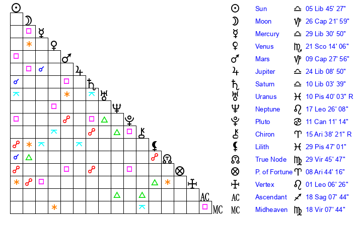 | Sun | 5 Libra 45 | 6 Libra 48 | 19 Capricorn 27 |