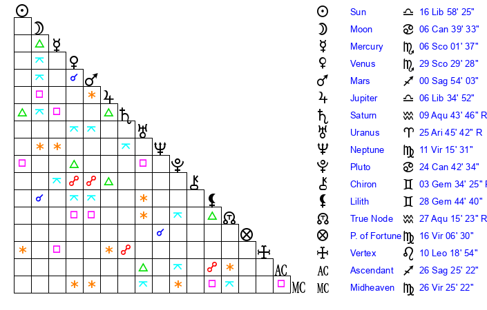 | Jupiter | 6 Libra 22 | 23 Cancer 33 | 21 Libra 46 |