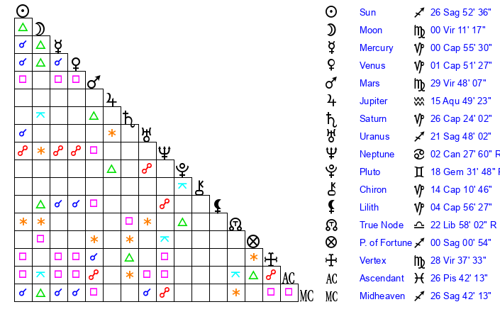 | Moon | 0 Virgo 1 | 24 Sagittarius 4 | 20 Aquarius 11 |