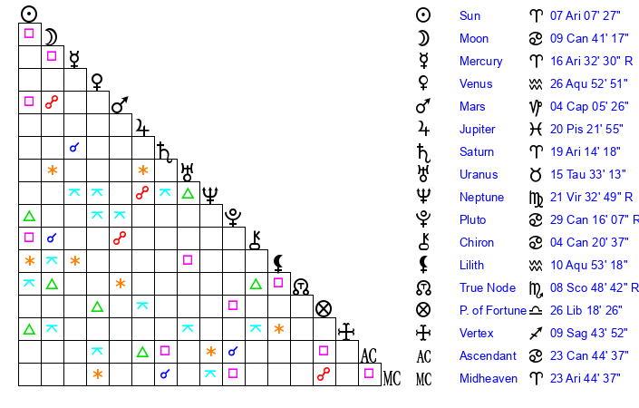 | Saturn | 19 Aries 21 | 24 Pisces 1 | 29 Aries 9 |