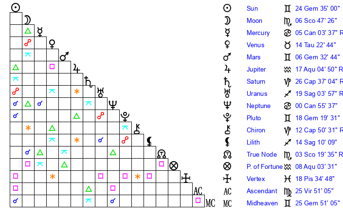 | Sun | 24 Gemini 35 | 25 Gemini 48 | 23 Libra 23 |