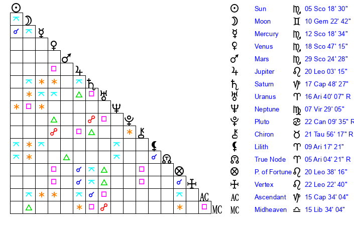 | Moon | 10 Gemini 25 | 6 Aquarius 51 | 27 Scorpio 37 |