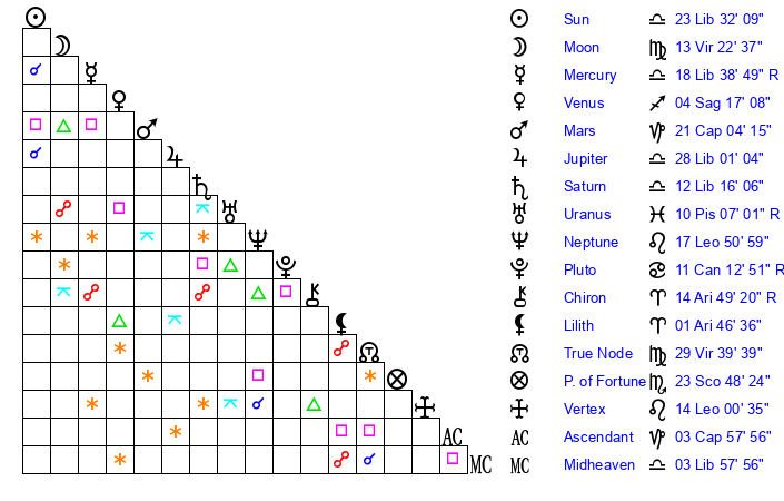 | Sun | 23 Libra 32 | 24 Libra 34 | 7 Aquarius 46 |