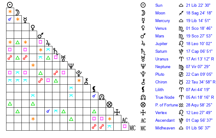 | Sun | 21 Libra 22 | 22 Libra 35 | 26 Capricorn 23 |