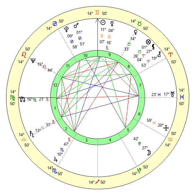 | Sun | 11 Gemini 7 | 12 Gemini 24 | 18 Virgo 54 |