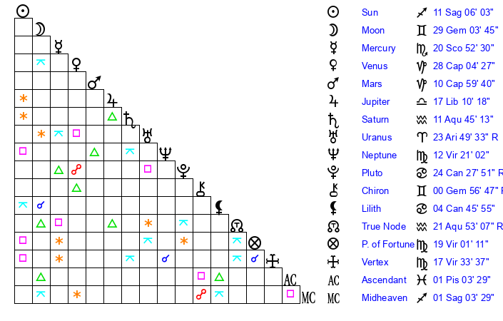 | Sun | 11 Sagittarius 6 | 11 Sagittarius 47 | 14 Pisces 26 |