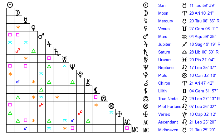 | Saturn | 28 Libra 40 | 27 Pisces 56 | 27 Libra 43 |