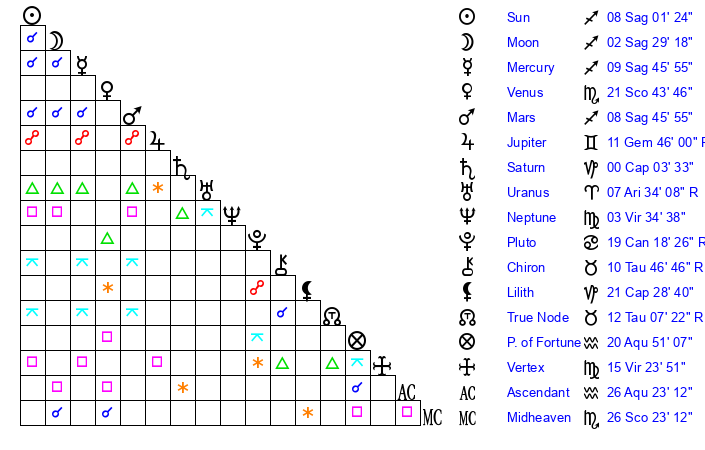 | Sun | 8 Sagittarius 1 | 8 Sagittarius 44 | 15 Pisces 24 |