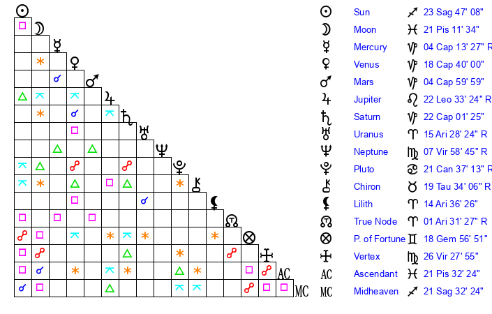 | Moon | 21 Pisces 16 | 12 Cancer 38 | 6 Leo 17 |