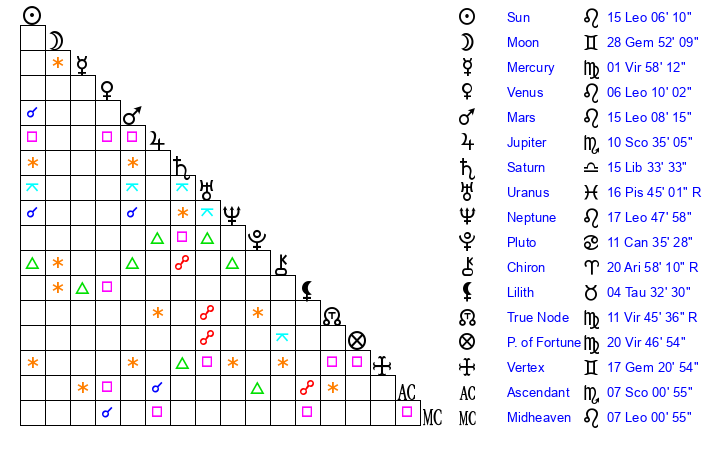 | Sun | 15 Leo 6 | 16 Leo 24 | 25 Scorpio 20 |