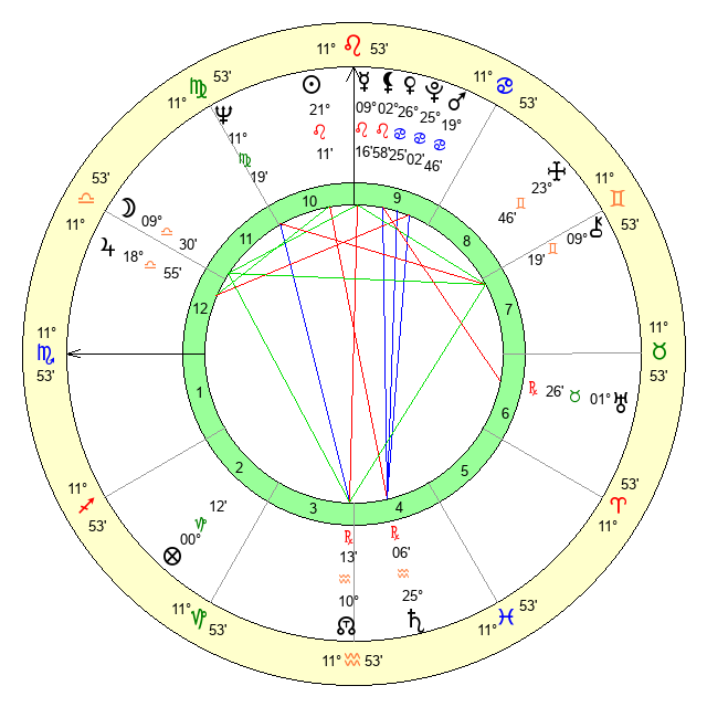 | Moon | 9 Libra 33 | 2 Taurus 2 | 15 Aquarius 17 |
