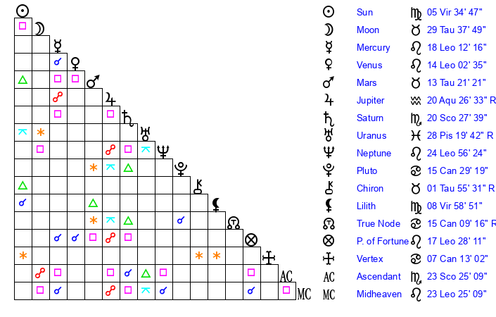 | Moon | 29 Taurus 41 | 19 Scorpio 37 | 1 Capricorn 45 |