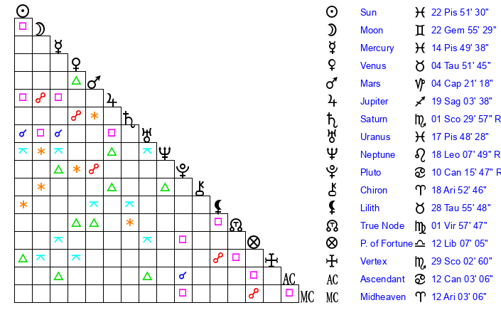 | Sun | 22 Pisces 51 | 23 Pisces 22 | 0 Cancer 57 |
