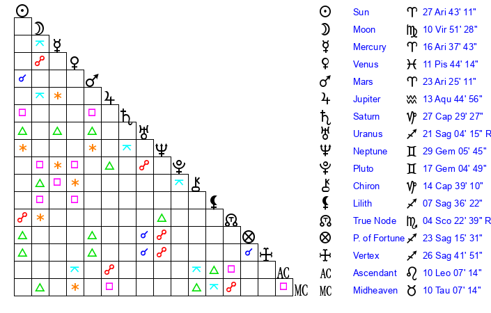 | Sun | 27 Aries 43 | 28 Aries 54 | 25 Leo 45 |