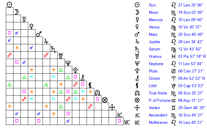 | Moon | 19 Scorpio 12 | 26 Cancer 17 | 23 Virgo 56 |