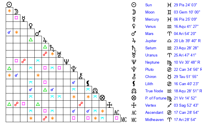 | Sun | 29 Pisces 24 | 0 Aries 20 | 27 Gemini 42 |