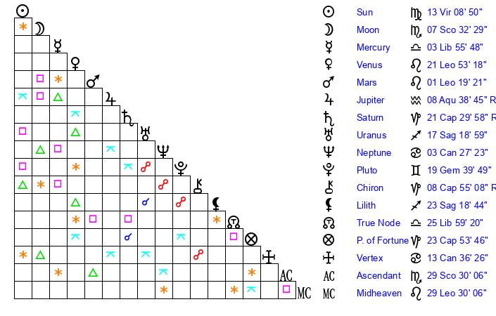 | Sun | 13 Virgo 8 | 14 Virgo 21 | 16 Capricorn 14 |